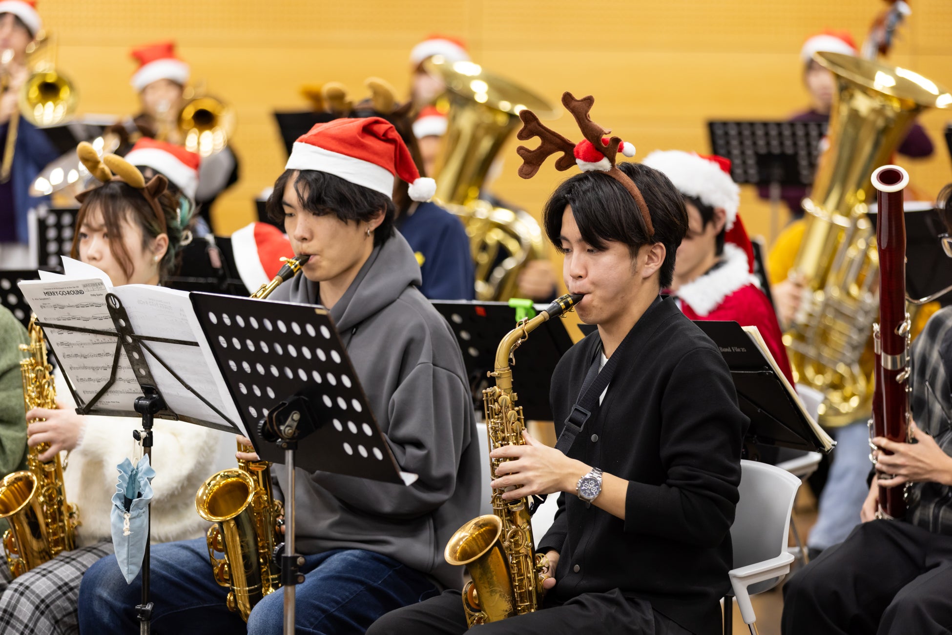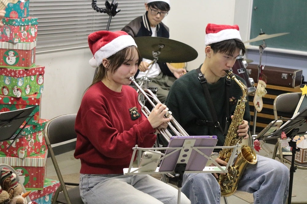 今、まさにクリスマスシーズン。応援指導部ブラスバンド部門とジャズ研究同好会に所属する学生たちが、心温まるクリスマスソングを演奏してくれました。