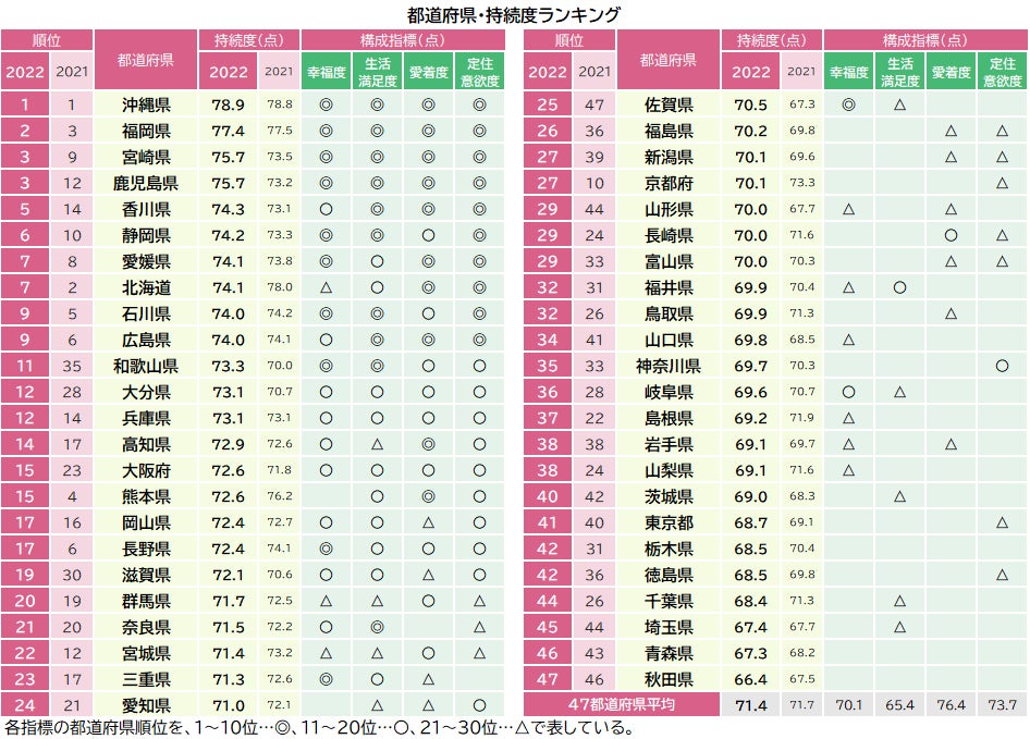 持続度が全国で最も高かったのは沖縄県で78.9点(前年78.8点)。同県は、幸福度、愛着度、定住意欲度の3つで1位、生活満足度についても2位と、すべての指標において高い評価を得ている。