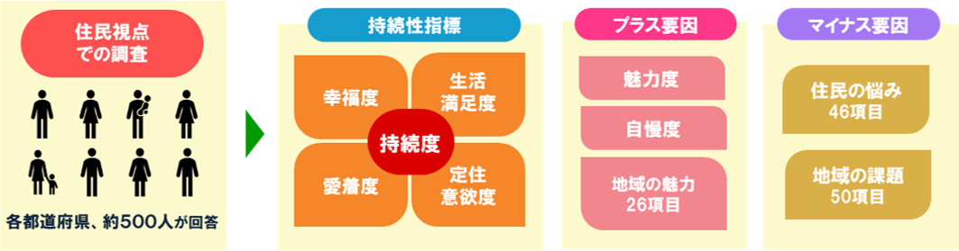 第4回地域の持続性調査2022は、15歳以上の男女を対象に、2022年5月20日から26日にかけてインターネットで調査を実施し、都道府県の住民をそれぞれ約500人ずつ計23,520人を回収し、調査時点で転居などの理由によりその地域に居住していない人を除く計22,973人の有効回答を得た。調査対象は47都道府県。幸福度、生活満足度、愛着度、定住意欲度という持続指標と、魅力度、自慢度、魅力項目というロイヤルティ指標、そして住民の悩みと、地域の課題に関する設問から構成している。