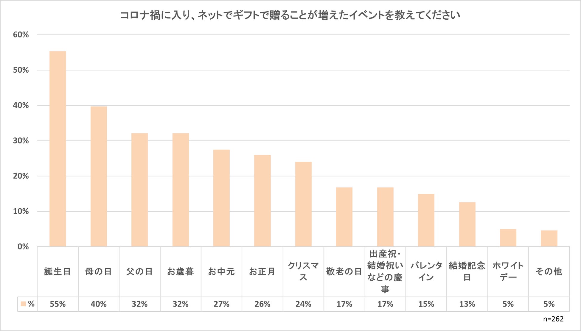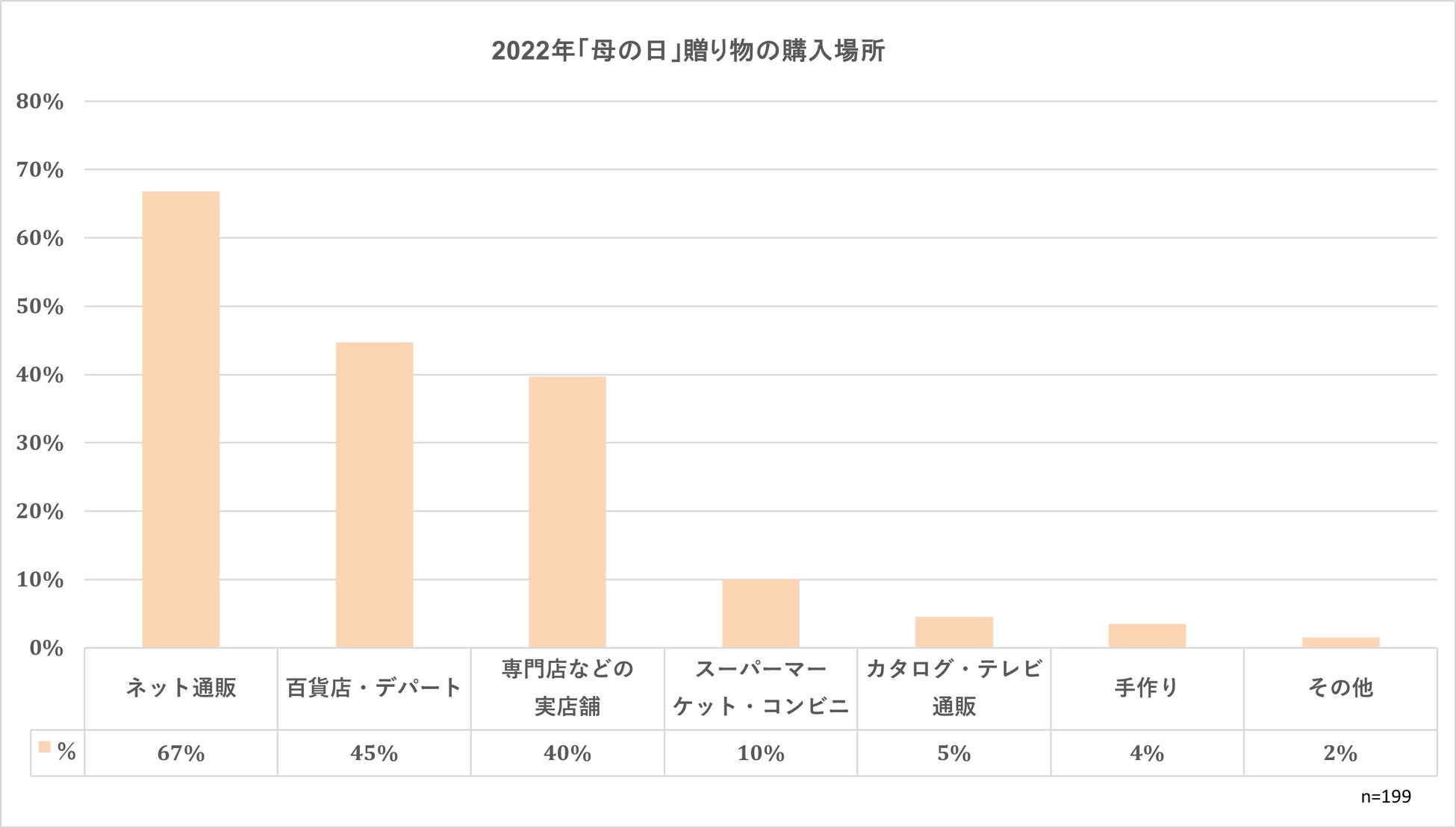 さらに、今年の「母の日」に関するアンケート(※2)では、プレゼントの購入場所として「ネット通販」が67%となり、移動や外出など人の動きが増える傾向にある中でも高い数値になっています。