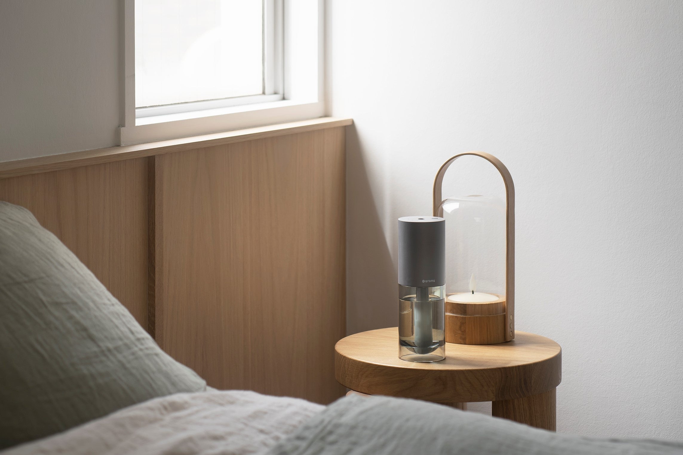 シンプルで透明感のあるデザインは、ベッドサイドでは存在感を放ちながらインテリアや空間の魅力を引き立てます。3段階の濃度設定で操作がシンプル。ONとOFFで切り替えが可能な白色LED照明が搭載されているので間接照明の役目も。