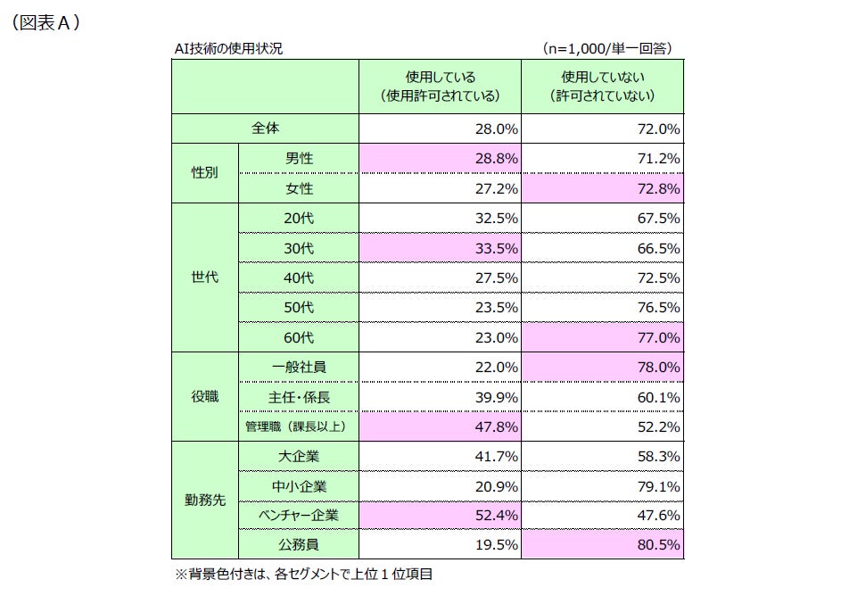 今回の調査では、「30代以下」「ベンチャー企業勤務者」など、新しい技術に敏感な層でAI活用が進んでいることが明らかになりました。また、役職別では「管理職(課長以上)」の使用率が半数近くに達しており、判断の迅速化や業務の効率化にAIが活用されている様子が読み取れます。