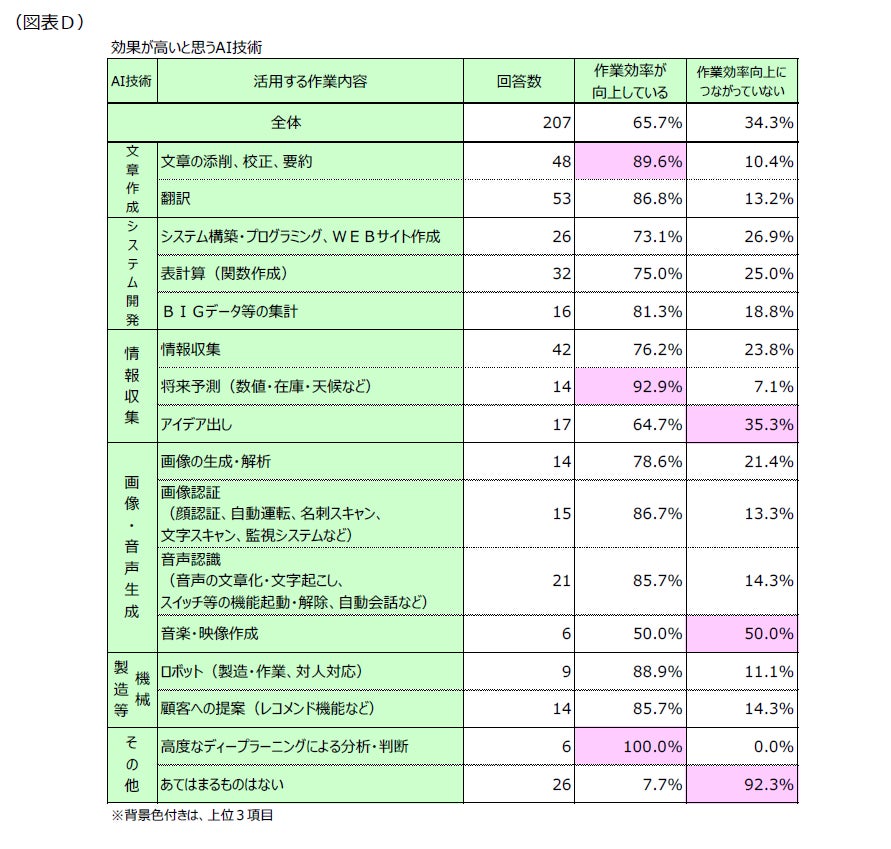 特に、前述(2)の結果を踏まえると、「文章の添削、校正、要約、翻訳」は、比較的導入が容易であり、効果を実感しやすいことがうかがえます。一方で、「高度なディープラーニングによる分析・判断」や「将来予測」におけるAI技術の活用は、活用のハードルが高い反面、作業効率への効果が高いことが分かりました。