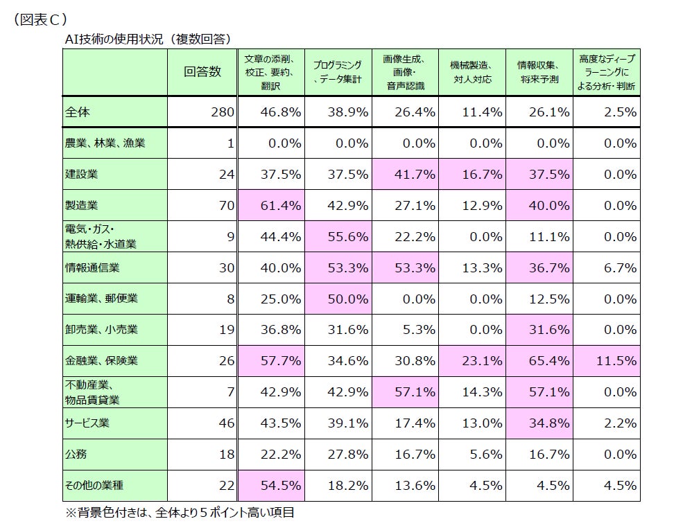 使用しているAI技術を業種ごとにみると、最も使用率が高い「文章の添削、校正、要約、翻訳」では、「製造業」(同61.4%)、「金融業、保険業」(同57.7%)において活用度の高さが目立っています。また、「プログラミング、データ集計」では、「電気・ガス・熱供給・水道業」(同55.6%)や「情報通信業」(同53.3%)、「運輸業・郵便業」(同50.0%)が、「画像生成、画像・音声認識」では、「不動産業、物品賃貸業」(同57.1%)、「情報通信業」(同53.3%)、「建設業」(同41.7%)において積極活用されている様子が表れています。