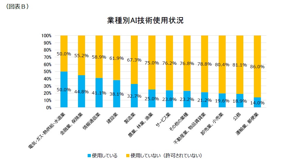 業種別では、「電気・ガス・熱供給・水道業」(同50.0%)や「金融業・保険業」(同44.8%)、「情報通信業」(同41.1%)において、使用率が40%を超え積極活用されています。一方で、「運輸業・郵便業」(同14.0%)や「公務」(同18.9%)、「卸売業・小売業」(同19.6%)においては、使用率が20%未満と、AI技術の業務への導入に慎重な姿勢がうかがえます。(図表B)