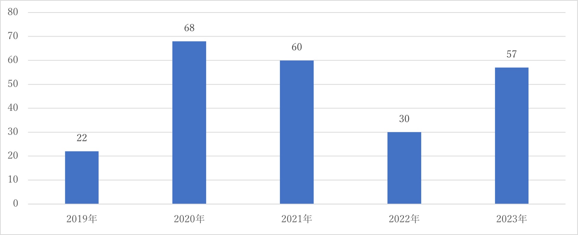 「少子化」のワードを含む入札公告は2018年から2022年までに237件でした。最多となったのは2020年の68件で、2022年まで減少しました。2023年にまた再び増加し57件となりました。