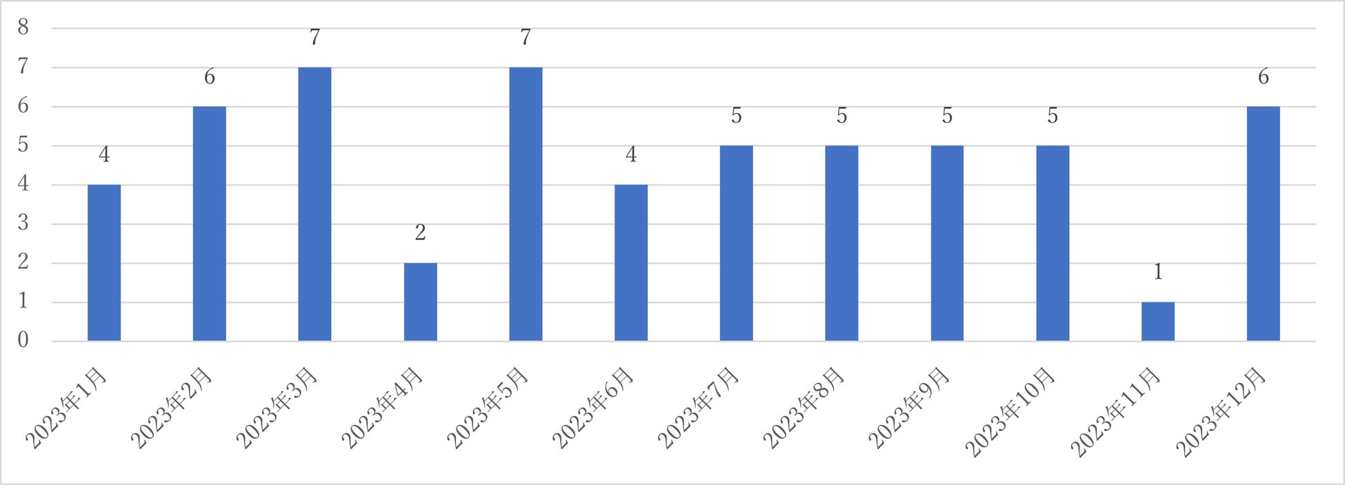 続いて、2023年の1月から12月までの「少子化」を含む入札公告件数の推移です。2023年の57件のうち、最多となった月は3月と5月で7件でした。2020年や2021年のように大きく変動せず、11月が最低となる推移は2022年に最も近い傾向となりました。