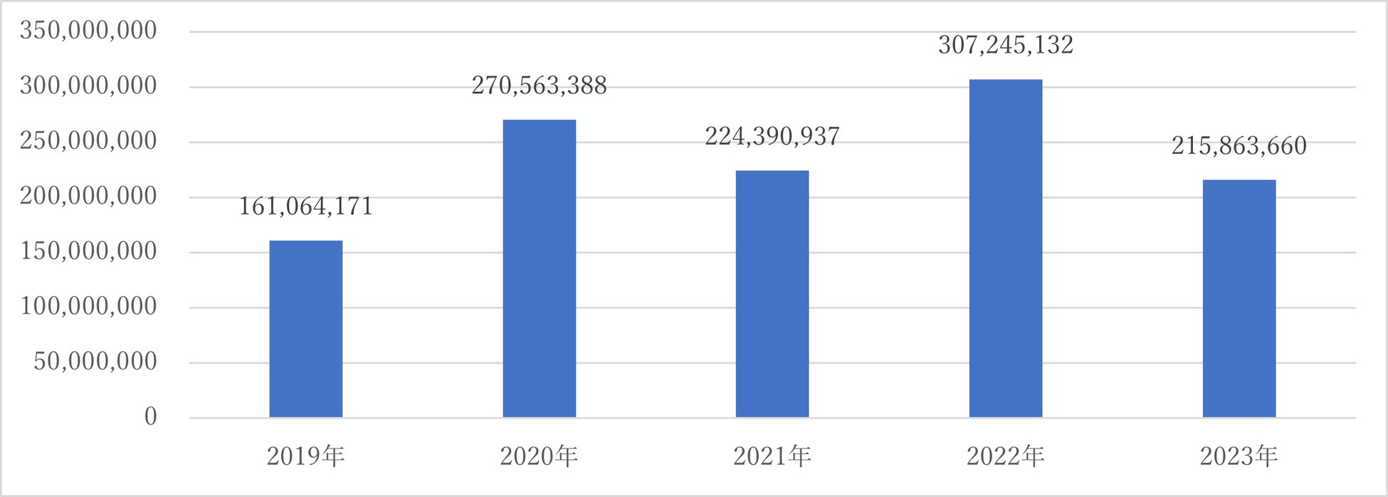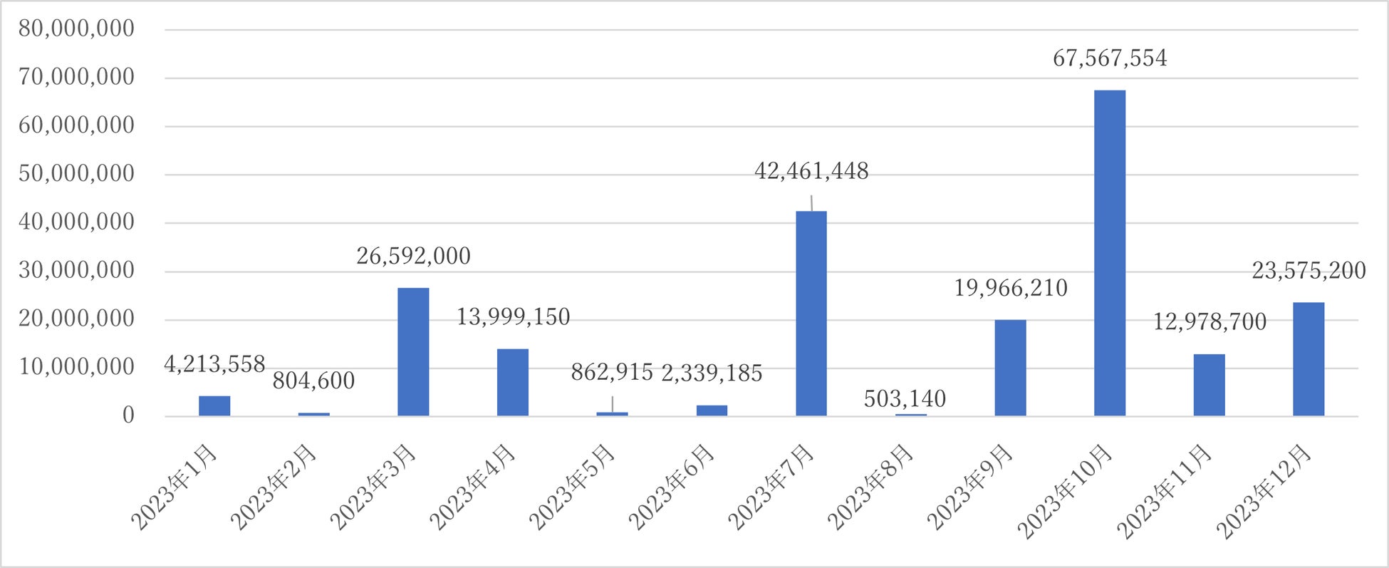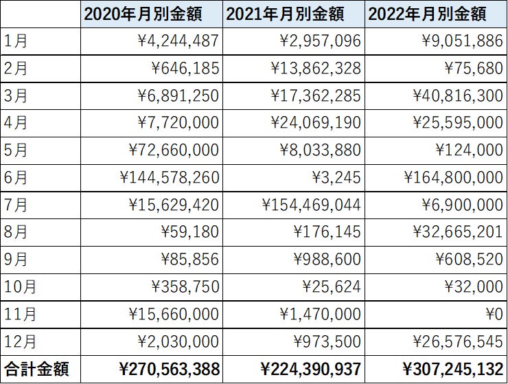 2020年から2022年までは上半期に多く落札されていました。各年は2020年と2022年が最高落札金額で、2021年は7月が最高落札金額となっています。