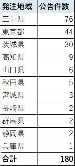 2019年から2022年までの合計としては、「三重県」が最多、次いで「東京都」となりました。また「茨城県」も30件と3番目に高い件数でした。この上位3県から180件のうち150件、約8割公告されています。