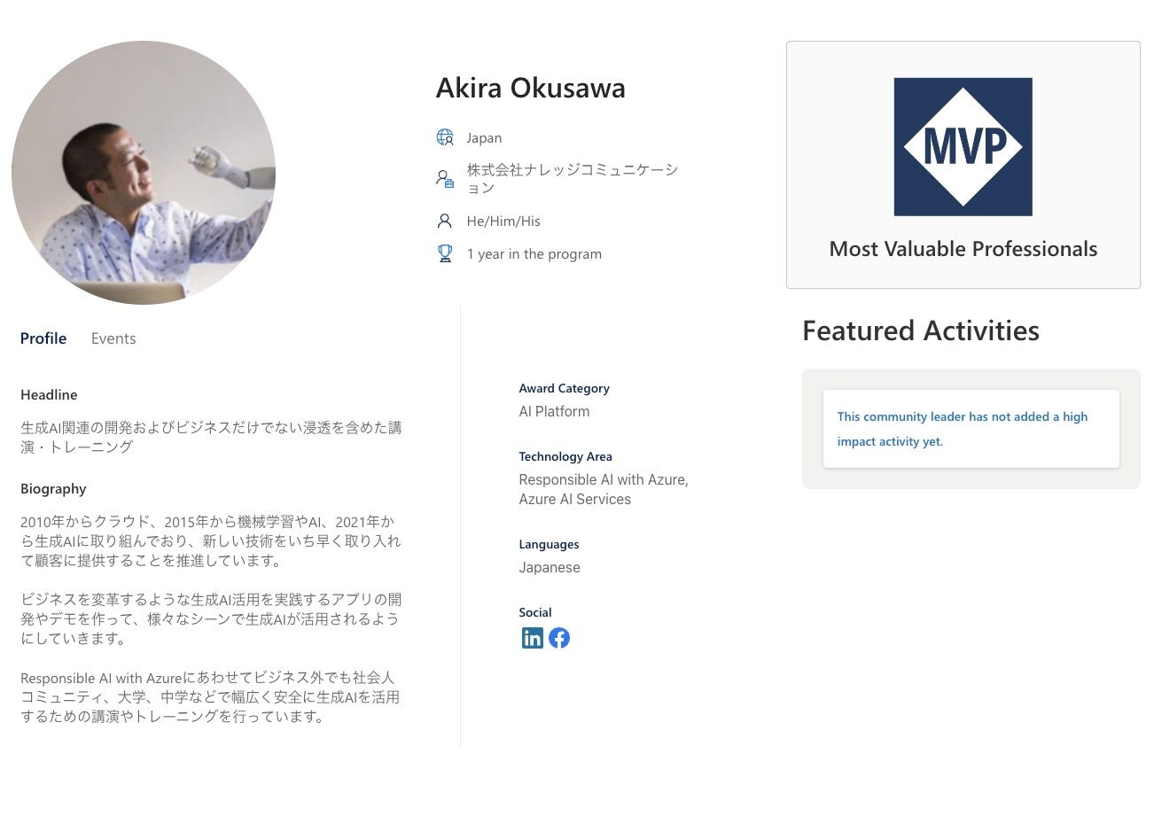 Microsoft AIに高い関心をお持ちいただき、ご自身で積極的に情報をキャッチアップいただくだけでなく、多岐に渡る業界でテクノロジーに携わる方々が集うイベントにてAIの活用や責任あるAIの原則についてご自身の学びをご共有いただき、技術ブログでAIの最新情報を発信いただくなど、コミュニティ活動に取り組んでこられました。そのような熱心な活動を高く評価し、この度2024年8月1日に奥沢さんをMicrosoft MVP for AI PlatformとしてMicrosoft MVPアワードプログラムにお迎えいたしました。