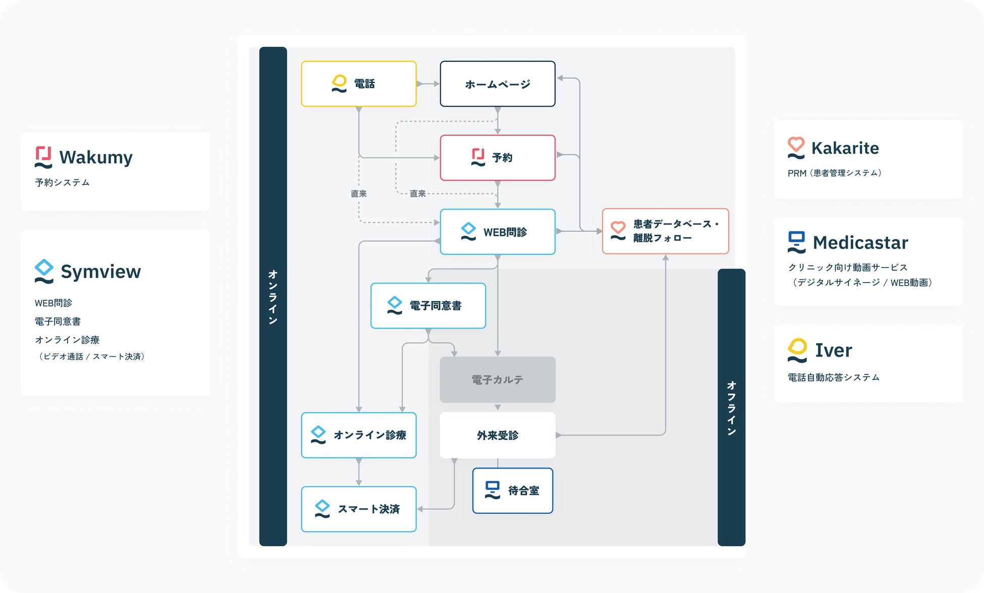 患者の受診動線を、レイヤードのプロダクトでトータルに対応することができます。