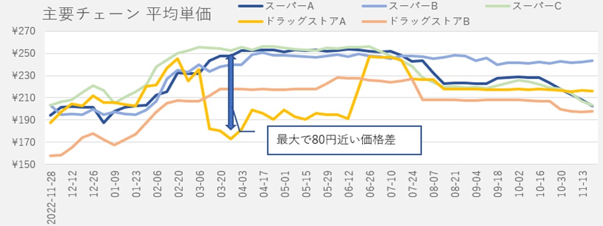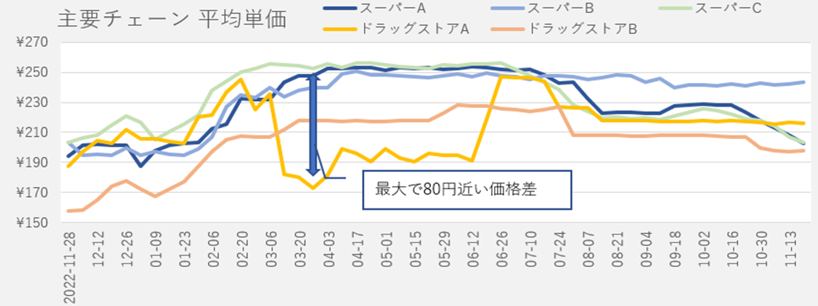 ※2022年11月28日週~23年10月30日週の週次データ(指標:平均単価)、各チェーン対象商品は異なるが入り数等の条件を揃えて抽出
