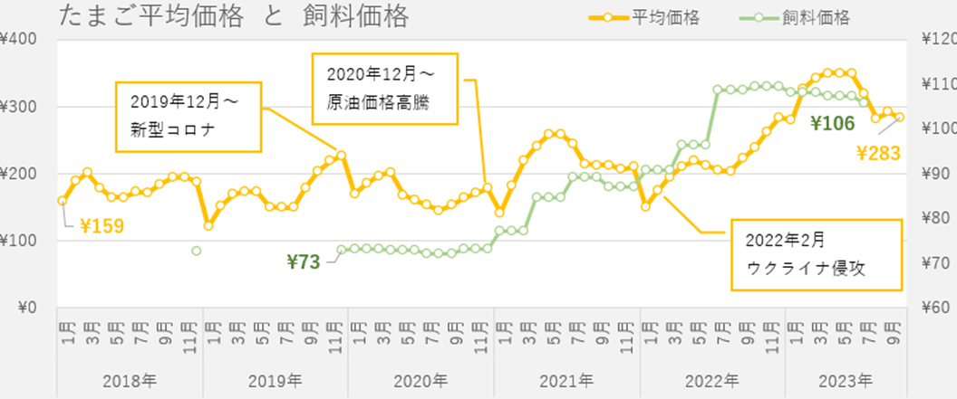 ※たまご平均価格:JA全農たまごM基準値(単位:円/kg(東京))、飼料価格:一般社団法人 日本養鶏協会 成鶏用飼料価格(単位:円/kg)