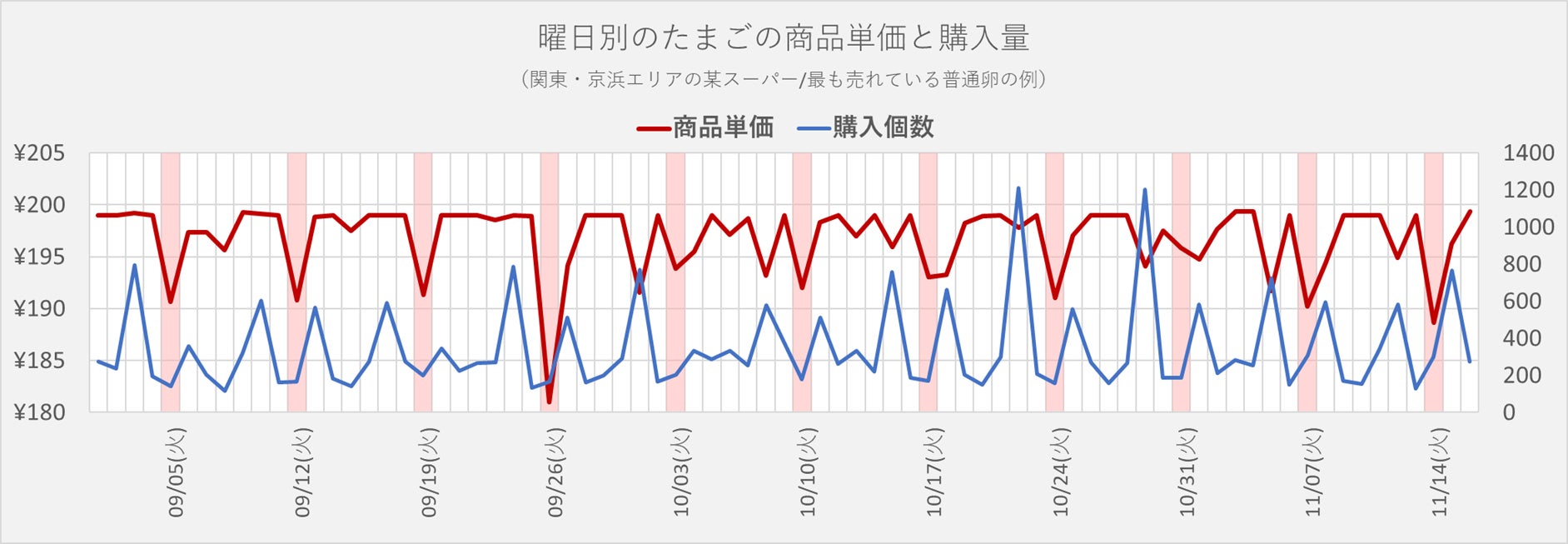 こちらのチェーンでは、火曜日に主力のたまごが安く売られている事が分かります。ではどうして火曜日が安いのでしょうか?その理由は火曜日にお店に来てほしいからです。スーパーは週末に利用される事が多いので、月曜日や火曜日はお客様の足が遠のきます。グラフの購入数に注目すると、火曜日は安く売られているにもかかわらず、購入数は少ないことがわかります。つまり、お店側は、まだまだお客様に来て欲しいのです。そのため、たまごをスーパーで買う場合は火曜日前後で特売が無いかを調べて買いに行くと良さそうです。この機会に普段利用しているお店を確認してはいかがでしょうか。