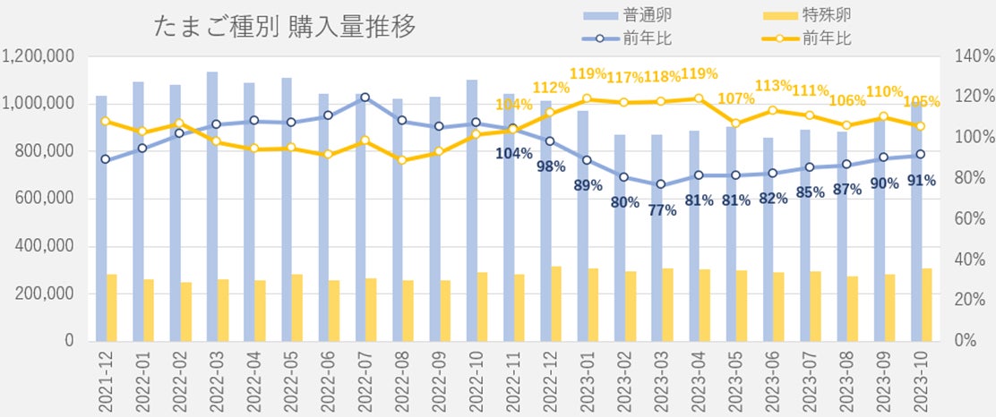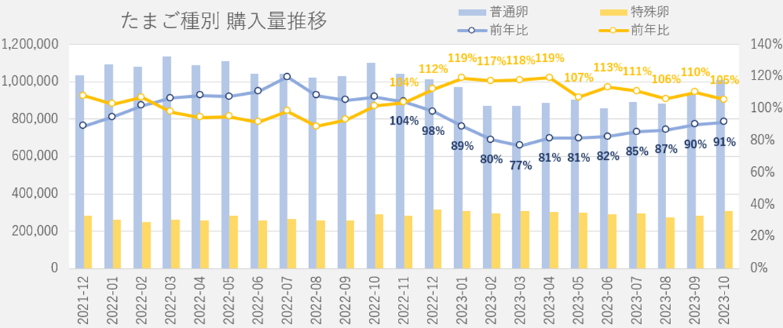 たまごの価格高騰は、たまごの種類にも変化をもたらしています。価格が上がり始めた昨年の秋頃から、普通卵の購入量が前年と比べ減少する一方、特殊卵の購入量が前年を大きく上回って推移しています。