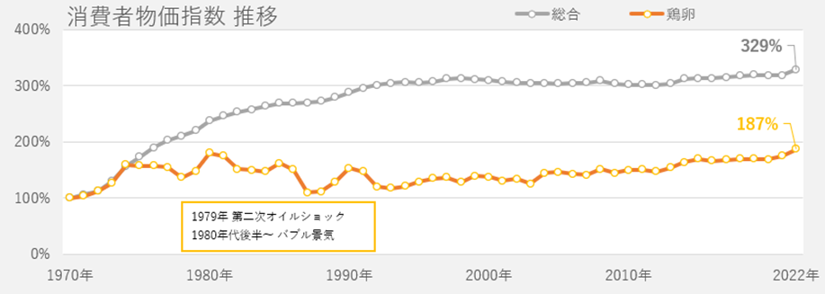 「物価の優等生」と呼ばれてきたたまご。そのいわれは長らく価格が維持されてきたことが背景にあります。下図は、1970年を基準とした消費者物価指数(価格変動の推移)を家計総合と鶏卵で比較したものですが、全体の増加率に比べてたまごの増加率はそれほど高くないことがわかります。これは一部補助金制度もありますが、主に生産から流通までの効率化など、生産者のコスト削減努力によって価格が保たれてきた背景があるようです。