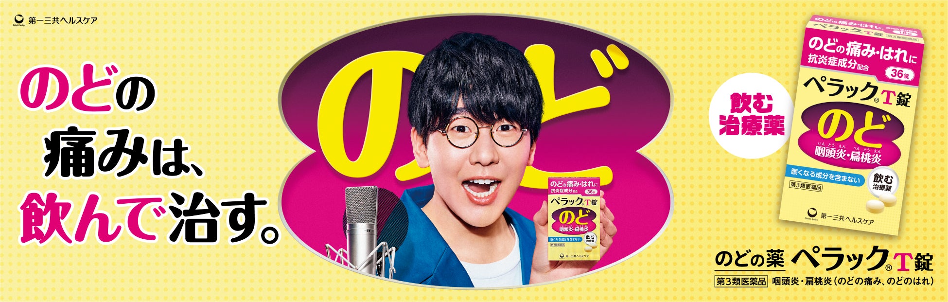 「ペラックT錠」は、のどの痛みやはれを飲んで治す治療薬です。1993年の発売以来、乾燥や季節の変わり目に起こる気温の変化など、様々な原因による炎症から起こるのどの痛みやはれに効く治療薬として、多くのお客様からご好評をいただいています。スペシャル動画では、のどに違和感を覚える花江さんが、「ペラックT錠」で対処し、のどの痛みを飲んで治す様子を熱演。清々しい表情で持ち前の伸びやかな美声を披露するシーンは必見です。のどの炎症による痛み・はれは、かぜ以外の原因からも起こるもの。声優という職業柄、日ごろからのどをケアしている花江さんの語りかけを通して、「のどの痛みは、飲んで治す。」という選択肢を提案してまいります。