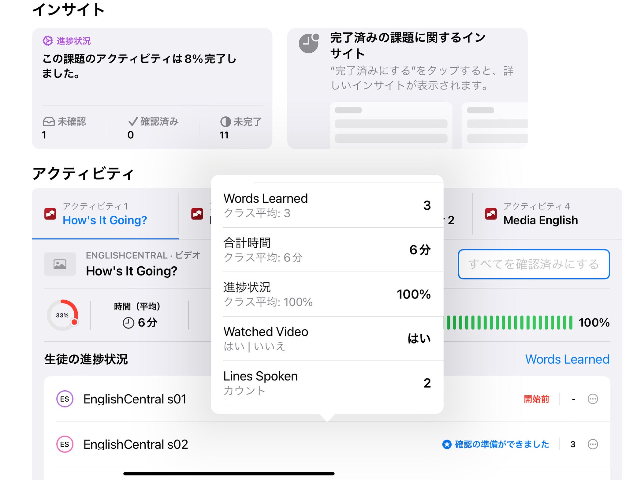 スクールワークからEnglishCentralをアクティビティとして課題に追加すると、冒頭に述べたような課題管理・学習管理やシングルサインオンが可能となります。