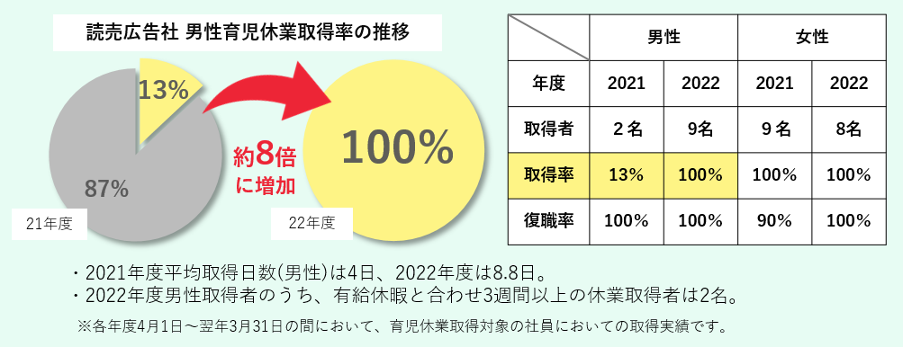 当社では、多様な“個”の力を尊重する企業カルチャーを大事にしながら一人ひとりが自分らしく活躍し成長できる環境作りを目指して様々な施策を推進しています。具体的には、株式会社ワーク・ライフバランスの「男性育休100%宣言」への賛同を始め、育児休業取得者への復職一時金の支給やサポート面談の実施、対象者をサポートする周囲のチームメンバーへのインセンティブ支給制度の制定など育児休業取得の推進に向けた様々な施策※を行なっております。その結果、2022年度において、取得対象の全男性社員9名の育児休業の取得を達成いたしました。
