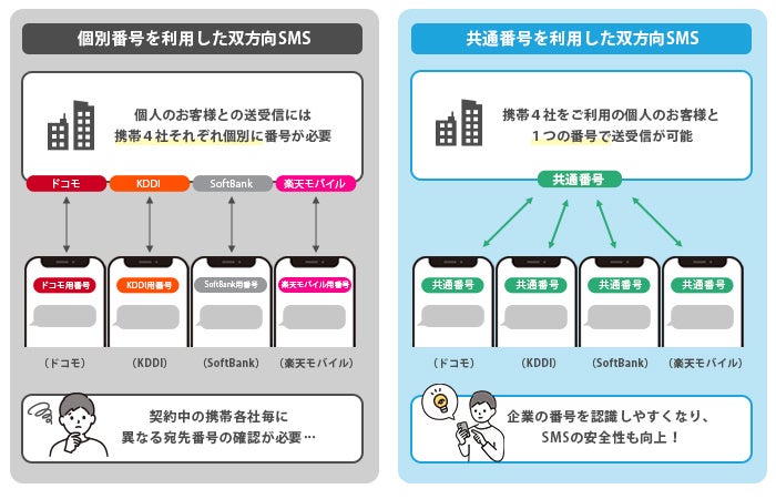 これまで個人のお客様とSMSを送受信する場合には、企業側が携帯4社の利用者向けにそれぞれ個別の番号を発行し、携帯会社毎に異なる発信元番号よりメッセージを送信する必要がありました。また、近年SMSを利用したなりすましやフィッシング詐欺行為が増加しており、企業がSMS送信時の番号をウェブサイトなどへ掲載し番号を周知するための時間も要しております。