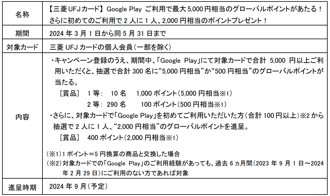 三菱UFJニコス、「三菱UFJカード」会員向けキャンペーン「Google Play」での5,000円以上の利用で、最大“5,000円相当”のポイントが当たる!