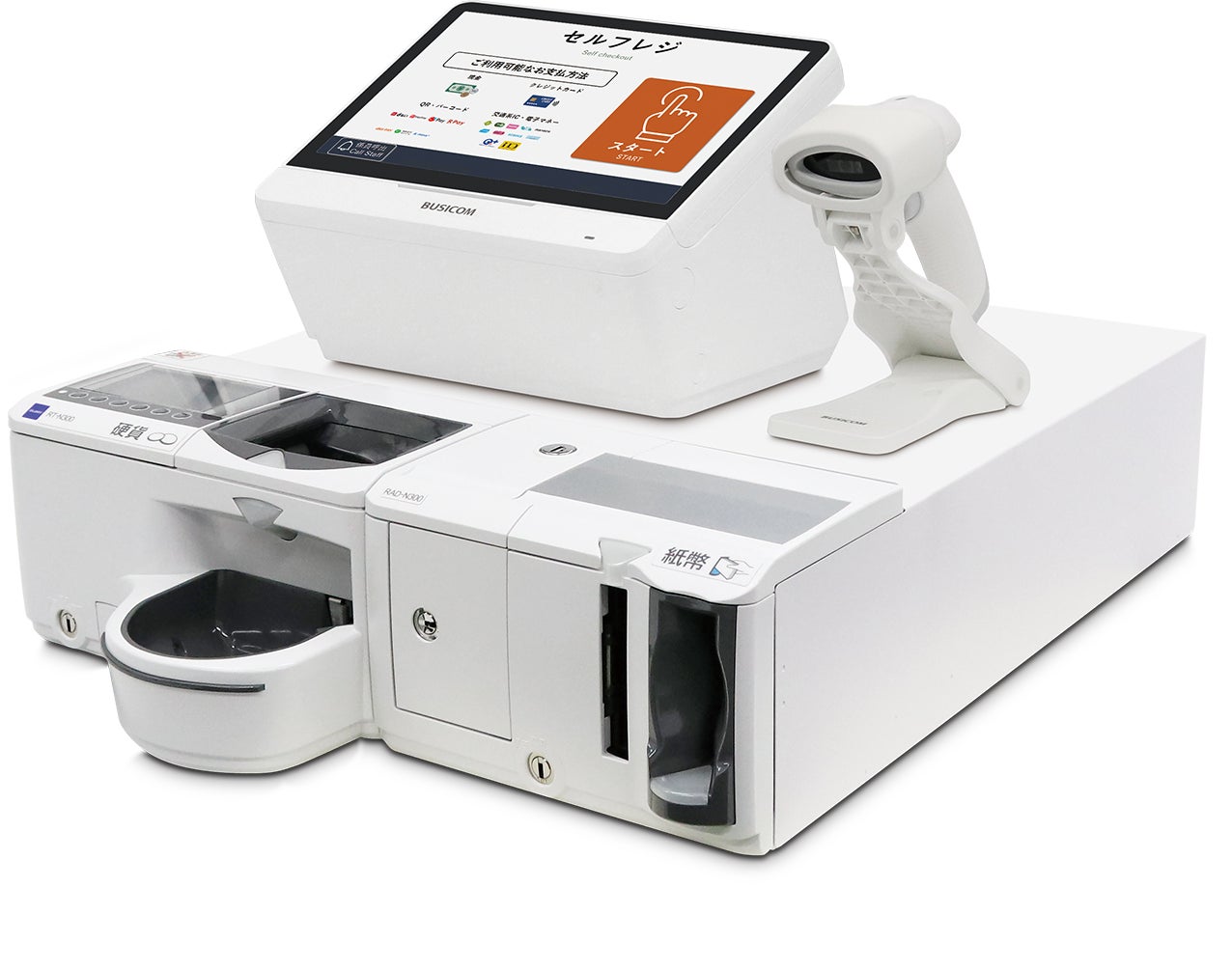 現金を扱わない完全キャッシュレスのセルフレジ運用に特化した構成です。自動釣銭機が不要なぶん設置スペースを抑えられ、コンパクトな筐体とシンプルなレイアウトでカウンター周りをすっきり保てます。限られたスペースでもスマートにセルフレジを導入したい店舗に最適です。