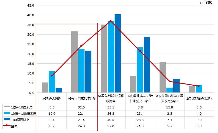 なんらかのAIを導入しているのは 8.7%(全体)、AI 導入が決まっている(24%)回答を加えると 32.7%となり、3割の事業者でAI活用が具体的になっていることがわかりました。一方、「導入予定がない」「あてはまるものはない」といった回答の合計は9パーセントにとどまりました。