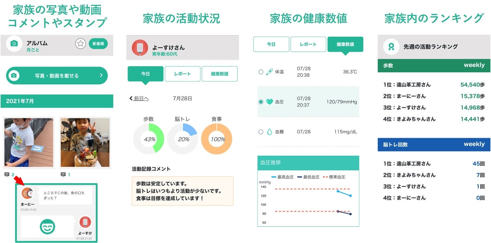 『家族サイト』は、家族の『脳にいいアプリ』健康活動状況(運動や食事管理、脳トレーニングの状況)をリアルタイムで見ることができます。『脳にいいアプリ』で、脳や体に健康上のリスクが検知された場合には家族にアラートが通知されるため、遠く離れて住んでいた場合でも、家族の健康リスクへ迅速に対応することができます。また、家族に写真や動画を共有できることや、家族と脳トレゲームを対戦することもできます。