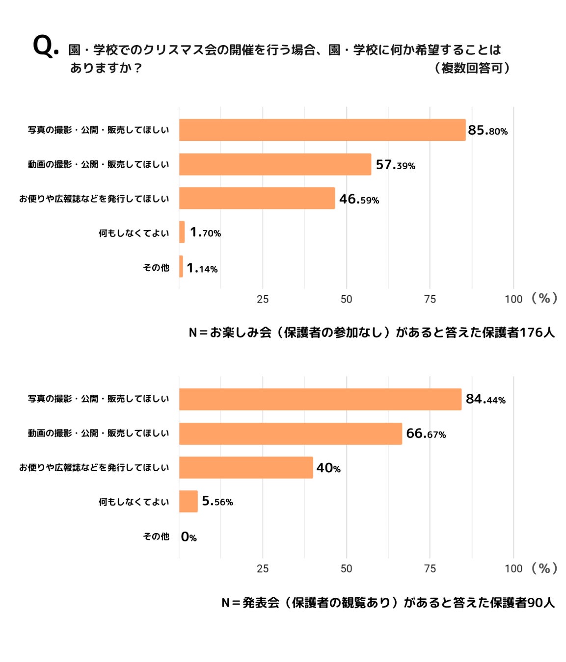 更に、クリスマス会の形式による違いをみてみると、お楽しみ会があると答えた保護者は「写真撮影をして公開・販売してほしい(85.8%)」「動画撮影をして公開・販売してほしい(57.39%)」、発表会があると回答した保護者は「写真撮影をして公開・販売してほしい(84.44%)」「動画撮影をして公開・販売してほしい(66.67%)」という結果で、保護者の観覧がある形式かない形式なのかに関わらず、どちらの場合も写真撮影や動画撮影を希望する保護者が多い傾向にあることが見て取れます。また、その中でも動画撮影については、お楽しみ会より発表会の方がやや需要が高いことが分かりました。