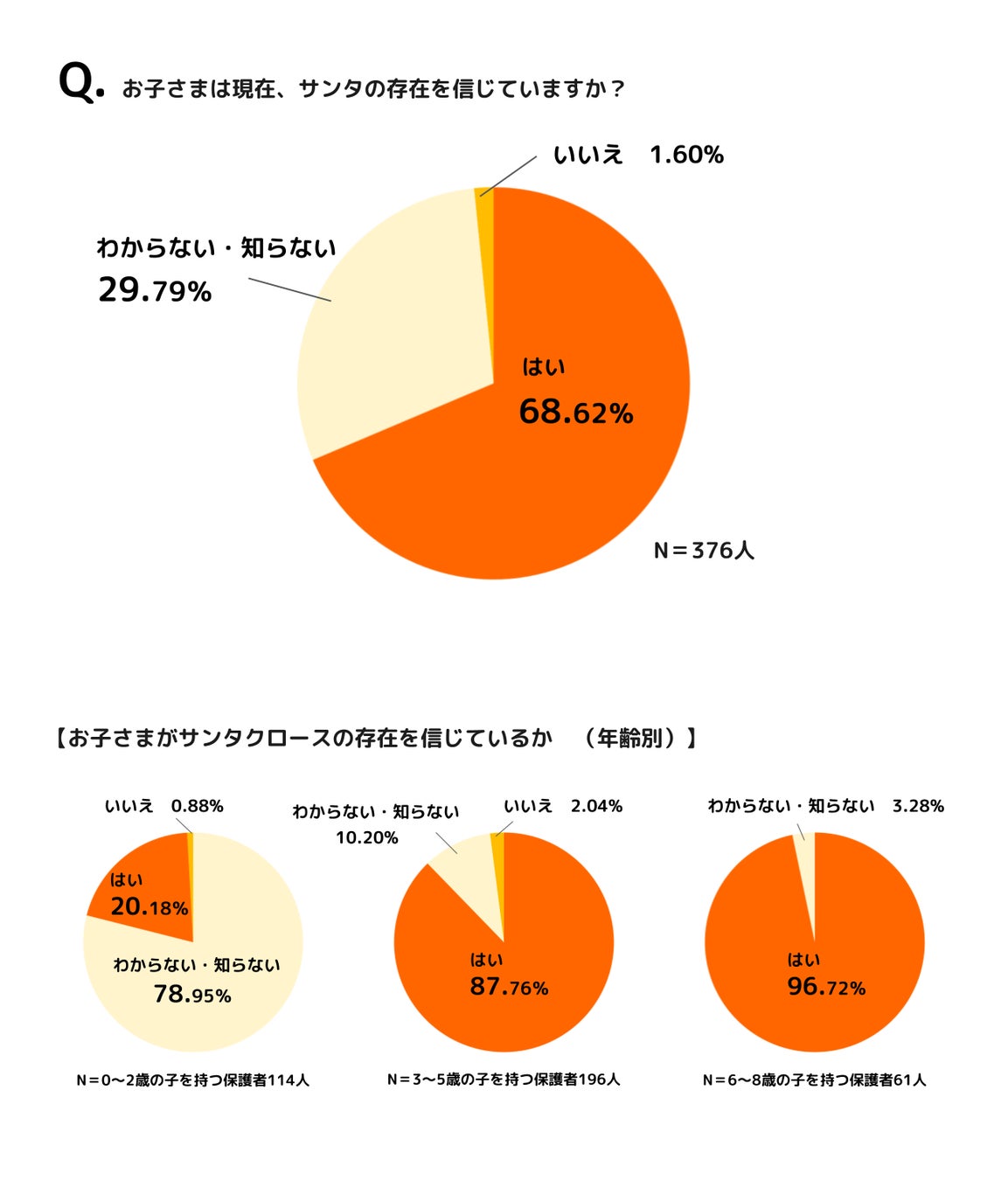 子どもがサンタクロースの存在をどのように認識しているか、0~15歳の子を持つ親に調査しました。子どもが現在サンタクロースの存在を信じているかを質問したところ「はい(68.62%)」「わからない(29.79%)」「いいえ(1.6%)」という結果となりました。年齢別でみると、0~2歳は「わからない(78.95%)」「はい(20.18%)」「いいえ(0.88%)」、3~5歳は「はい(87.76%)」「わからない(10.2%)」「いいえ(2.04%)」、6~8歳は「はい(96.72%)」「わからない(3.28%)」「いいえ(0%)」という結果になりました。2歳から3歳を境に「わからない」の割合が減っており、サンタクロースの存在を認識し始めるのが3歳ころだと見て取れます。また、3歳~8歳の子どもは約9割がサンタクロースの存在を信じているということが分かりました。