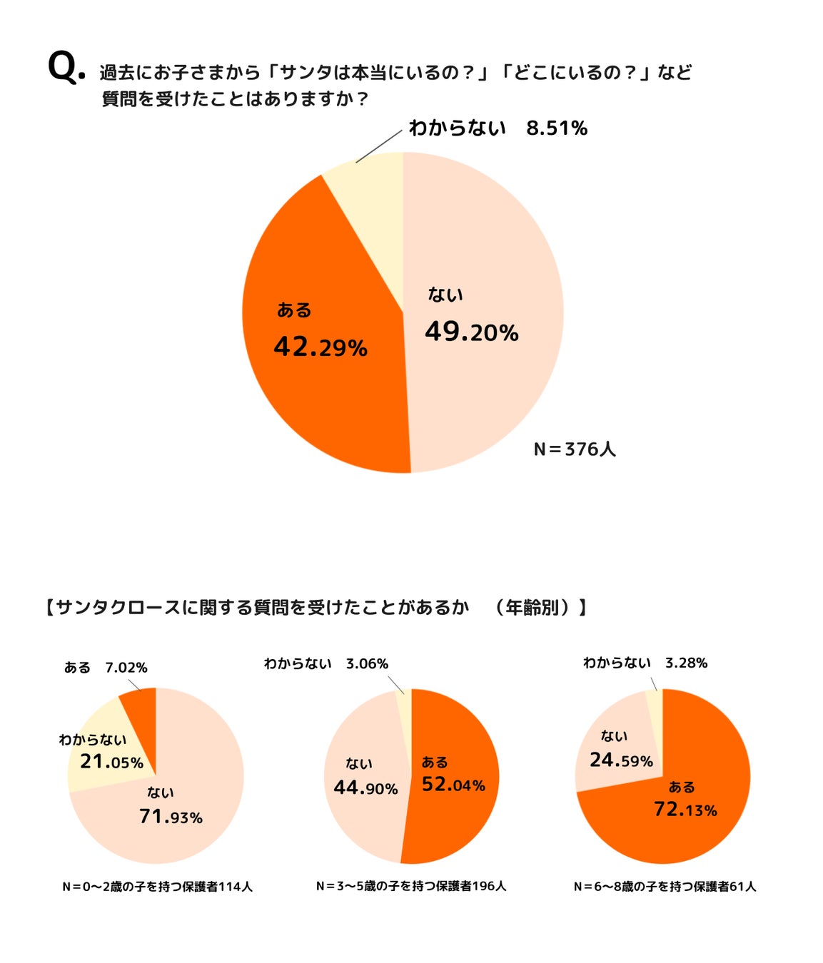 続いて、過去に子どもから「サンタは本当にいるの?」などサンタクロースについて質問を受けたことがあるかを聞くと、「ない(49.2%)」「ある(42.29%)」「わからない(8.51%)」という結果となりました。年齢別でみると、0~2歳は「ない(71.93%)」「ある(7.02%)」「わからない(21.05%)」、3~5歳は「ある(52.04%)」「ない(44.9%)」「わからない(3.06%)」、6~8歳は「ある(72.13%)」「ない(24.59%)」「わからない(3.28%)」という結果で、質問を受けたことが「ある」の割合が3~5歳くらいから増え始め、6~8歳では7割となっており、サンタクロースの存在について疑問を持つ傾向が高まるようです。