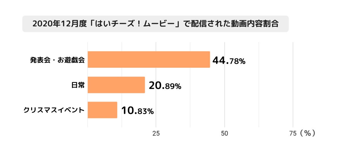 また、動画を手軽に保護者へ配信できるプラットフォームサービス「はいチーズ!ムービー」では2020年12月度に配信された動画について、動画内容ごとの配信数は、1位「発表会・お遊戯会」2位「日常」3位「クリスマスイベント」となっており、12月の園行事の中でも特に「発表会・お遊戯会」は定点で撮影することができるイベントでもあるため配信のしやすさもあり、動画配信の需要が高くなっていることが伺えます。