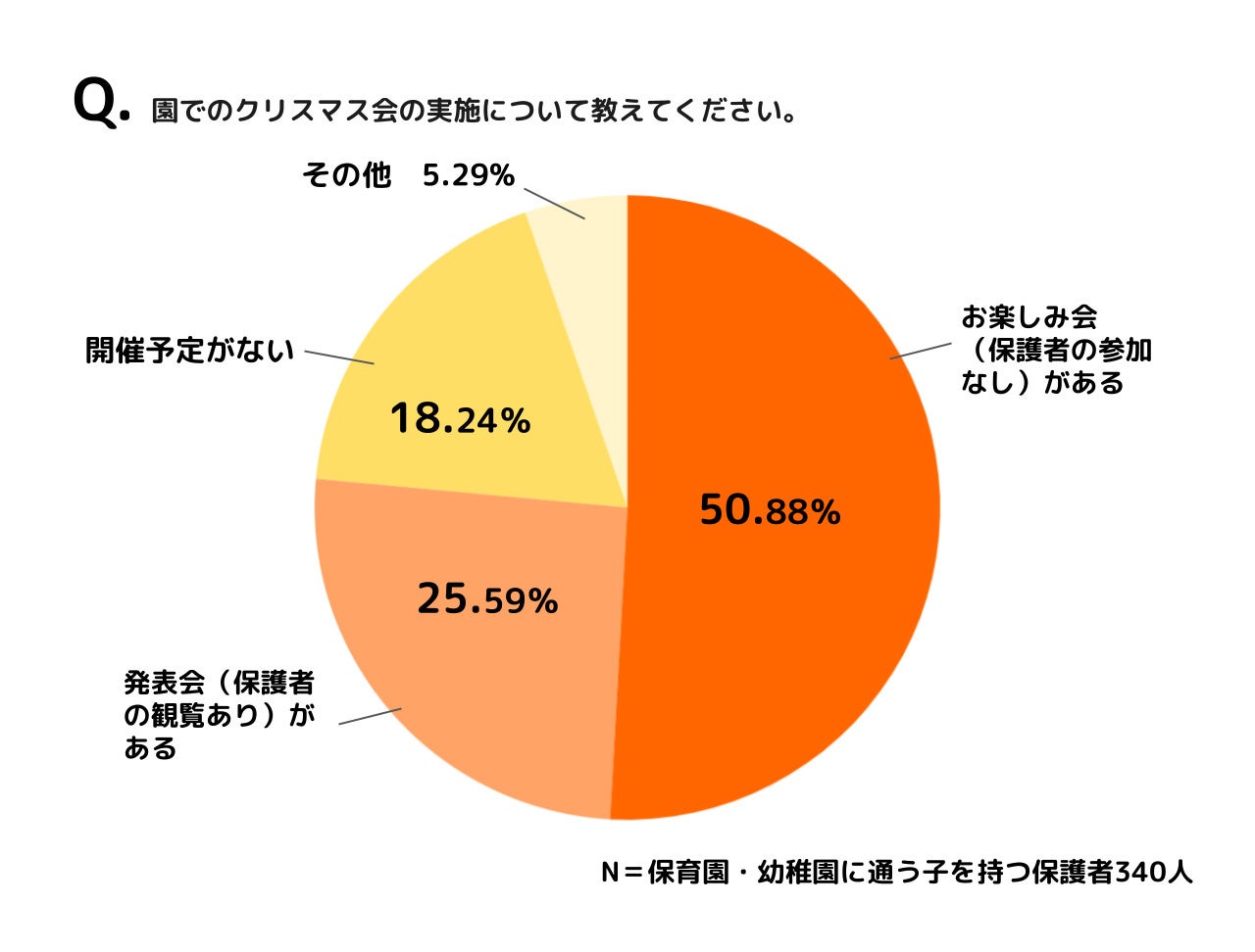 保育園・幼稚園での今年のクリスマスイベントの開催について、「お楽しみ会がある(50.88%)」「発表会がある(25.59%)」合わせて76.47%となり、7割以上がクリスマスイベントを開催予定であることが明らかとなりました。なお、イベント内容については「お楽しみ会」を実施する園が多く、「発表会」を実施する園の約2倍という結果となりました。