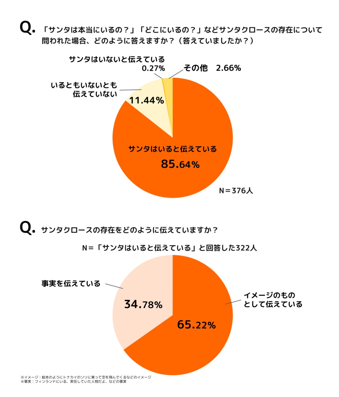 さらに、「サンタは本当にいるの?」などサンタクロースの存在について問われた場合どのように答えるか(答えていたか)を聞くと、「サンタはいると伝えている(85.64%)」「いるともいないとも伝えていない・曖昧にしている(11.44%)」「サンタはいないと伝えている(0.27%)」「その他(2.66%)」という結果となり、8割以上の保護者が「サンタの存在を肯定している」と答えていることが分かりました。
