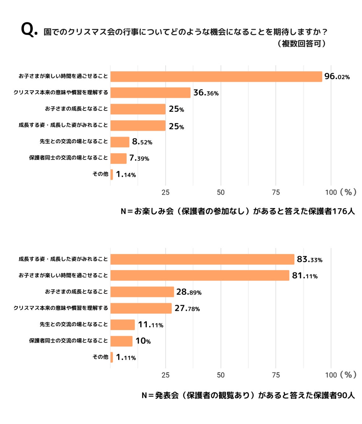 更に、園でのクリスマス会行事がどのような機会となることを期待するか質問したところ、お楽しみ会があると回答した保護者は「お子さまが楽しい時間を過ごせること(96.02%)」が一番多く、次いで「お子さまがクリスマスの本来の意味や慣習を理解すること(36.36%)」「発表会などを行いお子さまの成長の場となること(25%)」という結果となり、9割以上の保護者が「子どもが楽しめること」を一番に望んでいることが分かりました。それに対し発表会があると回答した保護者は「お子さまの成長する姿・成長した姿がみれること(83.33%)」が一番多く、次いで「お子さまが楽しい時間を過ごせること(81.11%)」「発表会などを行いお子さまの成長の場となること(25%)」という結果となり、開催される内容によって保護者の期待することも異なることが分かりました。