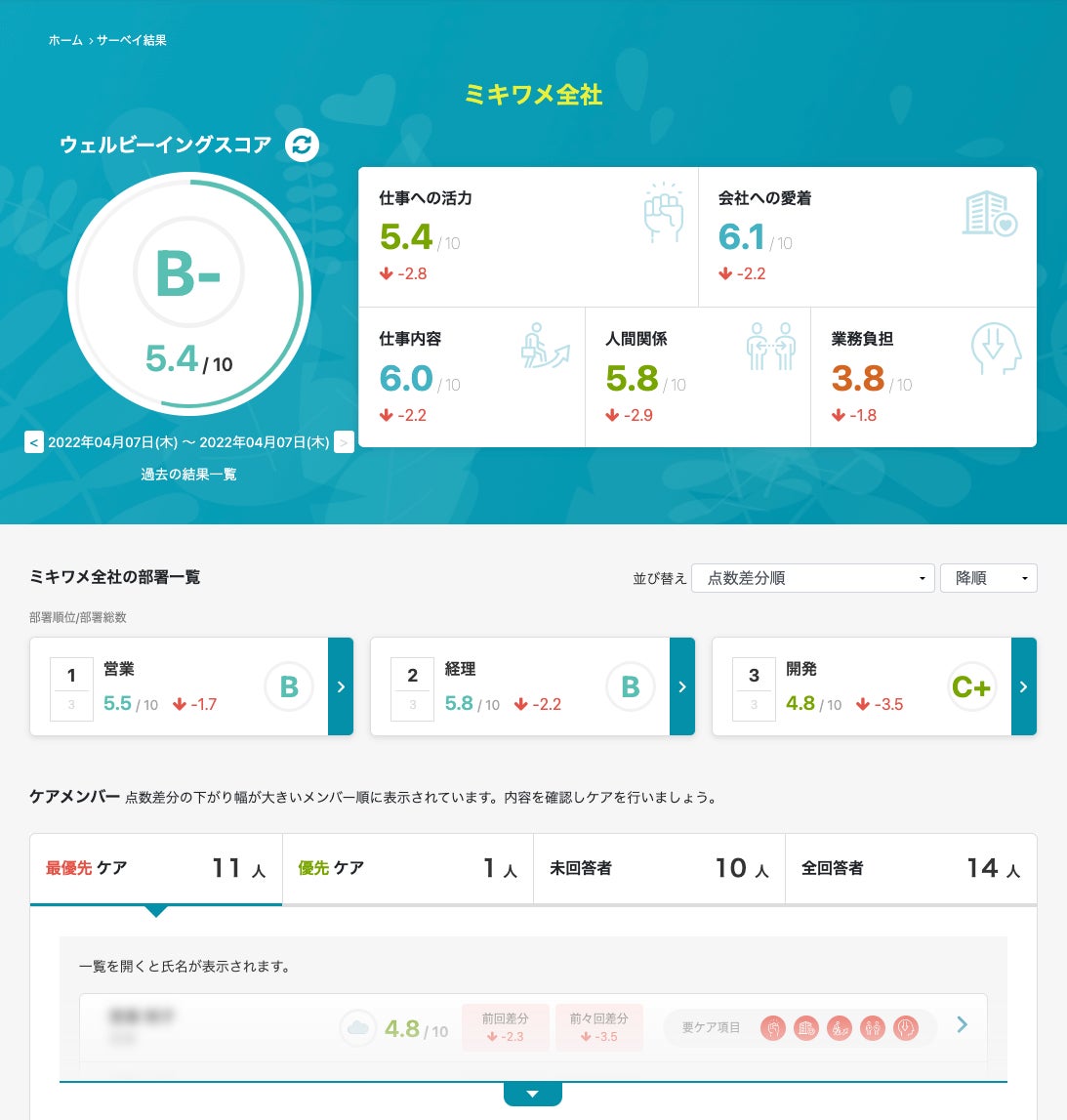 組織と社員のメンタル状態や、優先ケアメンバーをひと目で把握できます