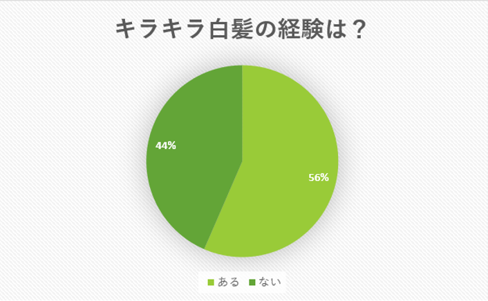 では、アンケートの中身に入っていきます。キラキラ白髪の経験はありますか? という質問には、実に56%もの方が「経験がある」と回答しています。