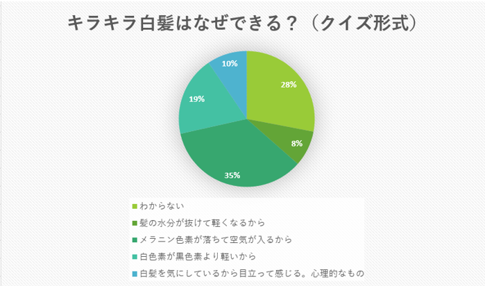 では、キラキラ白髪の原因は何だと一般の方は考えているのでしょうか? クイズで5択より【キラキラ白髪はなぜできる?】とアンケートに掲載してみたところ、以下の結果となりました。