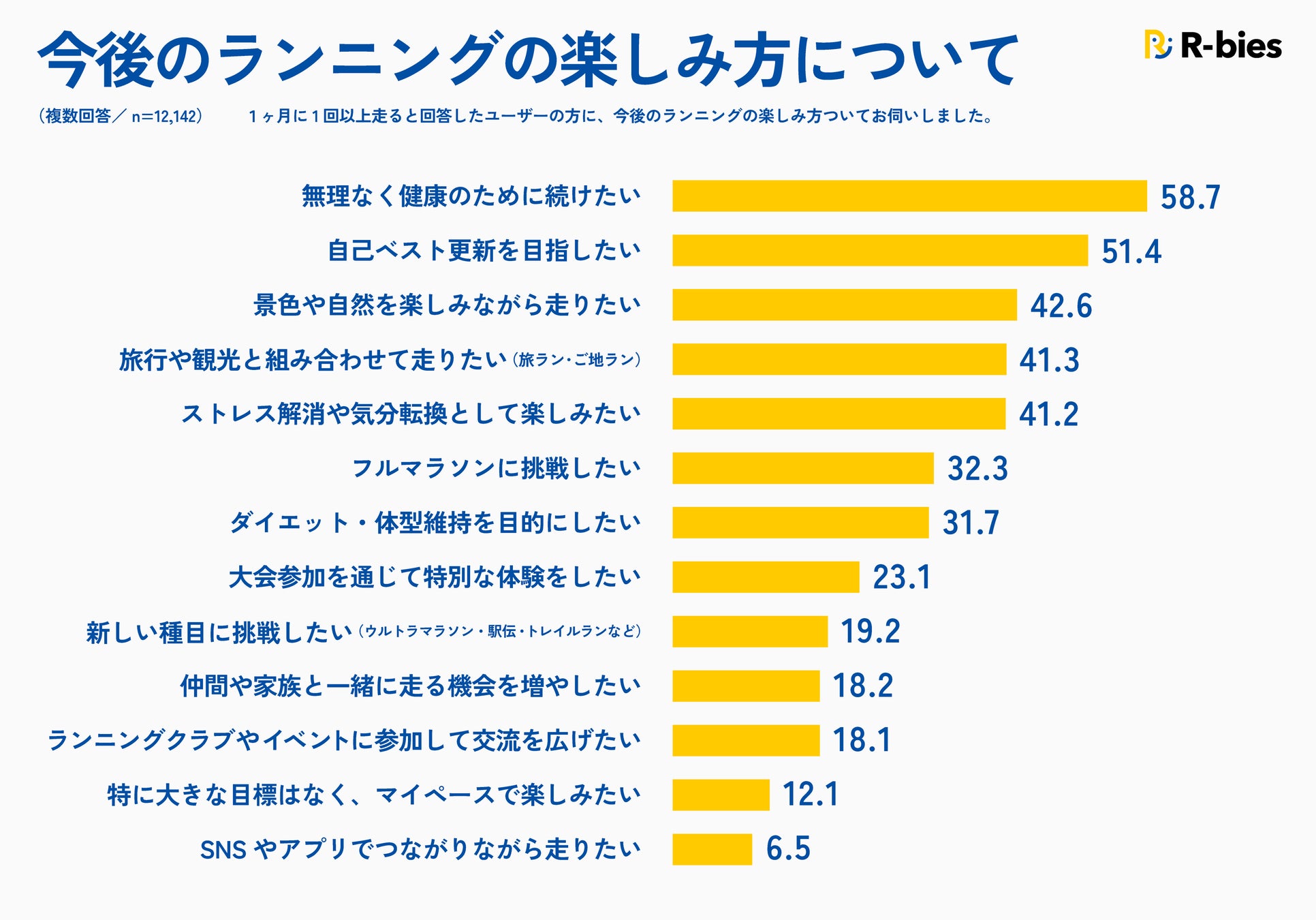 今後のランニングの楽しみ方(複数回答)については、「健康維持」(58.7%)、「自己ベスト更新」(51.4%)といった志向に加え、旅行や観光と組み合わせてランニングや大会に出場する「旅ラン」が4割以上、仲間や家族と一緒に走る機会を増やしたいも約2割と、新たな楽しみ方への関心も高く示されました。