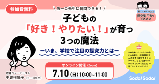 株式会社セイバンが運営する探究子育てまなびメディアサイト「Soda!Soda!」では、‟子どもの「好き!やりたい!」が育つ3つの魔法~いま、学校で注目の探究力とは~”と題して、SEIBANスマイルメンバーズ※向けにzoomによるウェビナーを開催いたします。