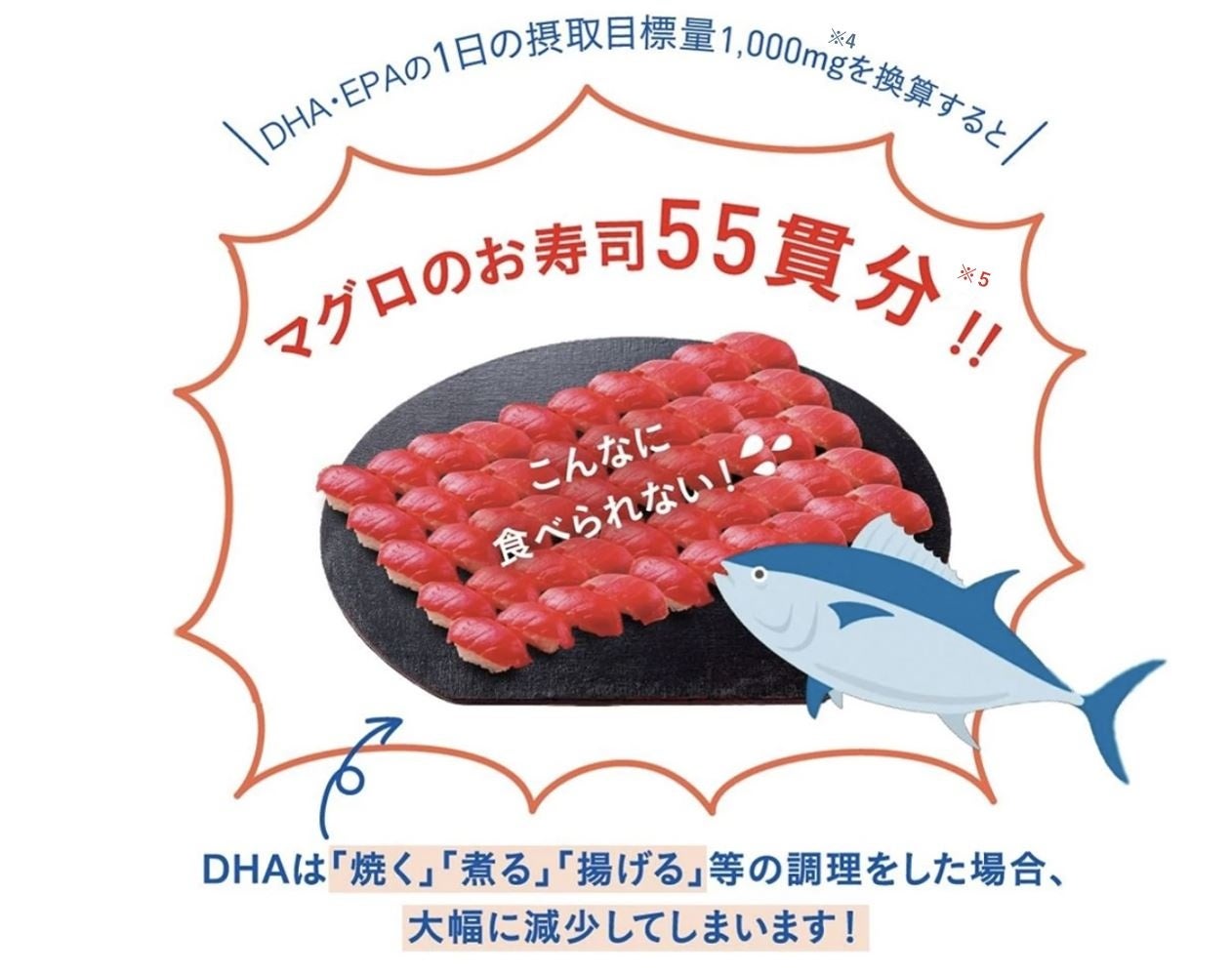 ※2 DHA1,000mgをくろまぐろ(天然・赤身・生)寿司ネタ1切れ(15g)あたりに換算すると、約55.4貫分となります。栄養成分値:日本食品標準成分表2020年版(八訂)、1単位当たりの重量:オールガイド食品成分表2017