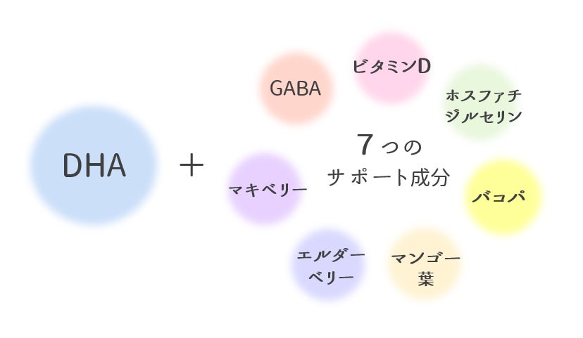 DHA含有精製魚油(国内製造)、澱粉、γ-アミノ酪酸、 エルダーベリー果汁末、バコパ抽出物、マンゴー葉抽出物、マキベリー 抽出物、大豆レシチン抽出物/グリセリン、ゲル化剤(カラギナン)、グリ セリン脂肪酸エステル、酸化防止剤(ビタミンE)、ビタミンD