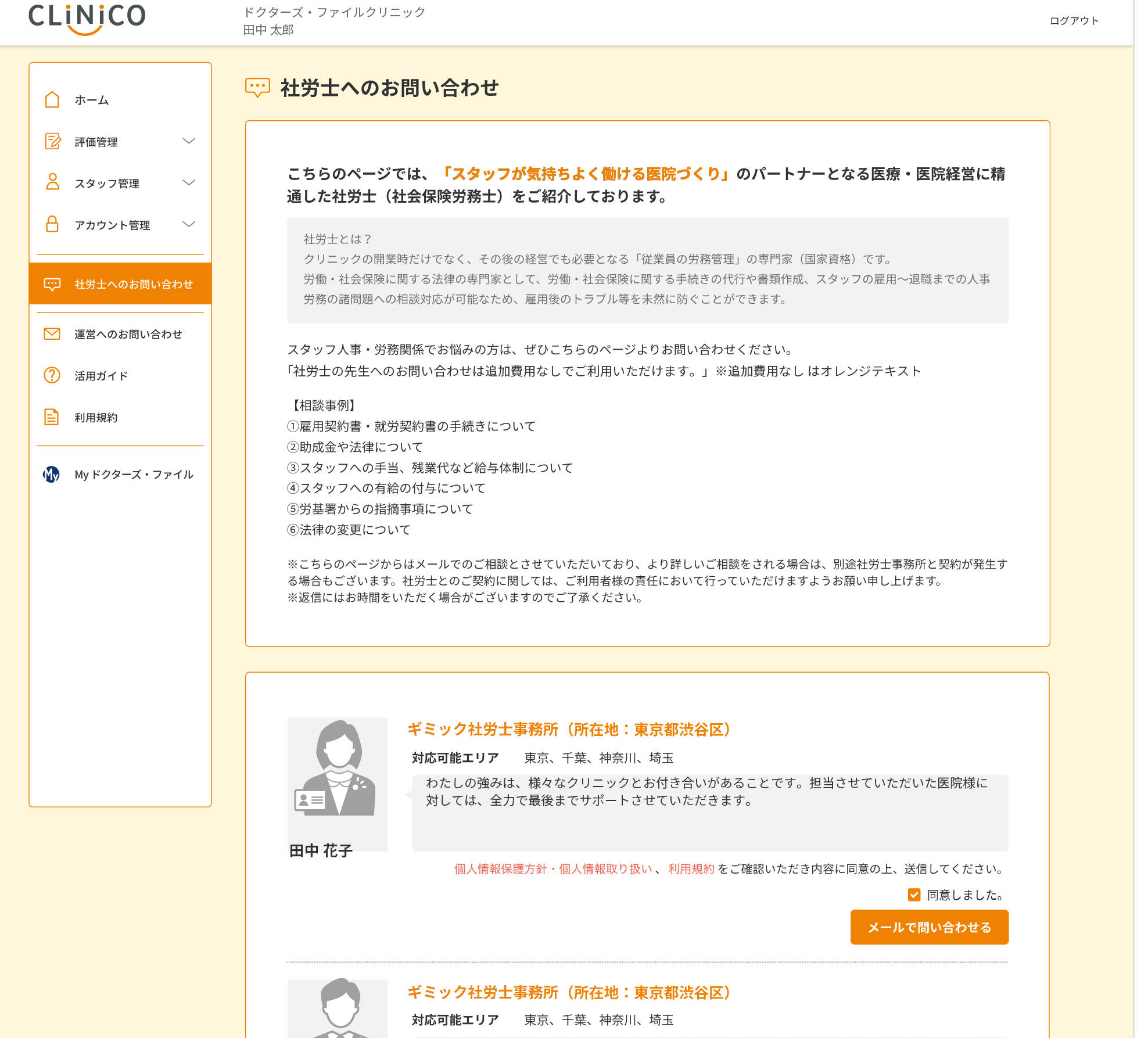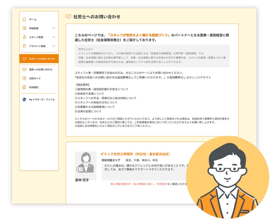 クリニック経営に精通した社会保険労務士(社労士)へのお問い合わせ機能を搭載。就業規則や雇用に関する相談など、クリニックの人事や労務に関連する問い合わせが可能に。他にも労務関連のヒントとなる情報やデータも掲載を予定しております。