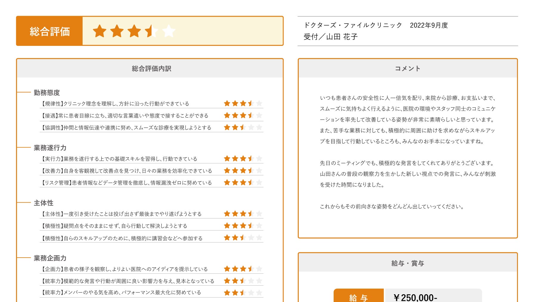 ドクターズ・ファイル クリニコのシステム上で行った評価データはスタッフとの振り返り面談で利用できるよう、印刷出力が可能。評価結果をもとにスタッフと目線合わせを行うことでモチベーションアップにつなげることができます。