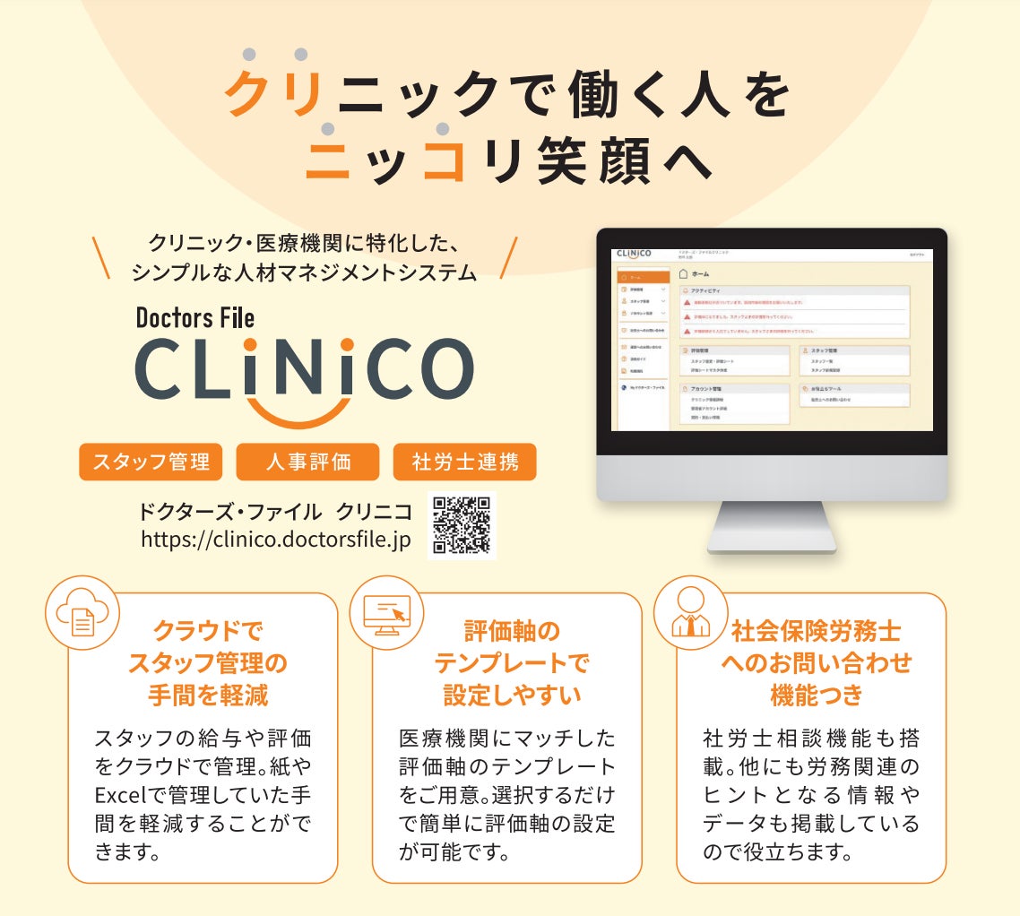 クリニック・医療機関に特化したシンプルな⼈材マネジメントシステム「ドクターズ・ファイル クリニコ」で、経営者・労務責任者の⼈事評価導⼊における負担軽減とスタッフの定着化を実現