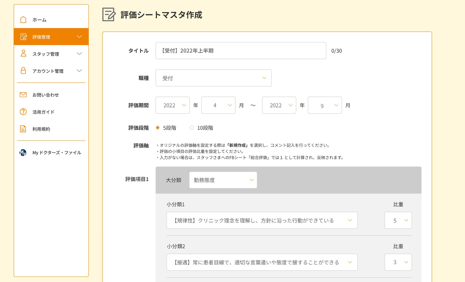 「評価項目を考えるのが大変」という先生でもご利用いただけるよう、医療機関にマッチした評価項目のテンプレートをご用意。選択するだけで簡単に自院にあった評価項目を設定していただけます。