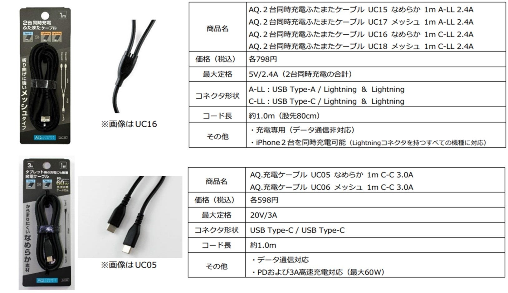 ケーブルは全14タイプをそろえ、1本で2台同時に合計2.4Aで充電できる二股タイプと、USB Power Delivery(*1、以下PD)に対応している1本タイプがあります。ケーブルは束ねても絡まりにくいなめらか素材と、繰り返しの折り曲げや伸ばしに強いメッシュ素材の2種類をラインアップ。