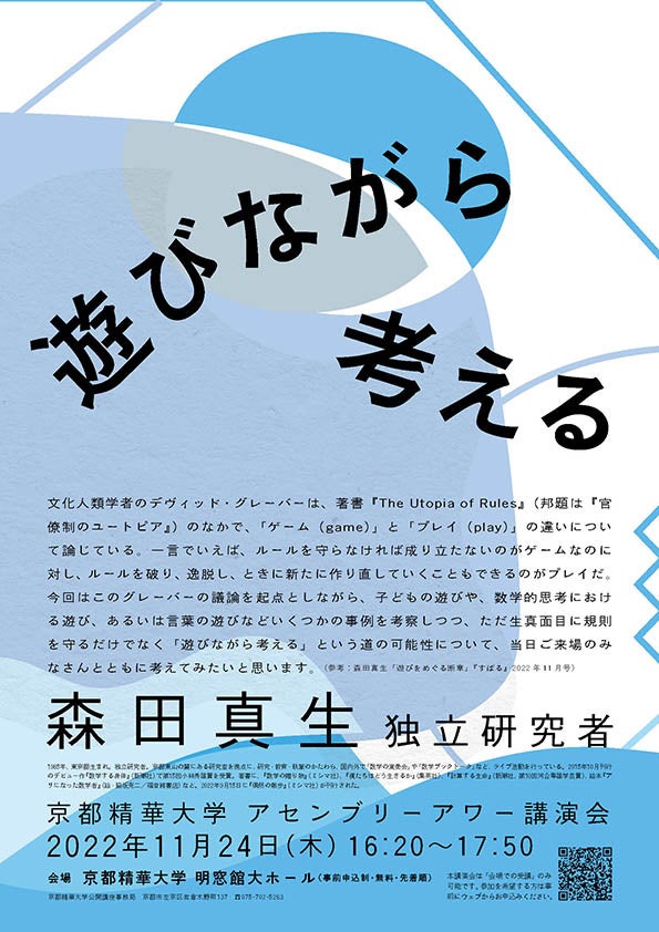 11月24日(木)京都精華大学アセンブリーアワー講演会 ゲストに独立研究者の森田真生さんを迎えて、講演会「遊びながら考える」を開催(事前申込制・無料・先着順)