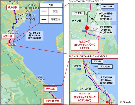両物件はいずれも、近年、製造業の進出が加速するベトナム中部に位置しており、下図のとおり、それぞれ中部の輸出入拠点であるダナン港・ダナン空港及びクアロー港・ビン空港とアクセスが良く、広域物流拠点として至便な場所にあります。このうち「セムコープ ロジスティクスパーク(ゲアン)」は、2023年9月にハノイ市とゲアン省を結ぶ高速道路が開通したことから、物流拠点としての魅力がより高まっています。