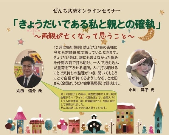 今回のセミナーは、全国きょうだいの会事務局長 太田信介氏、福岡きょうだい会 小川洋子氏を講師にお招きし、対談形式で「きょうだいである私と親との確執」をテーマに実体験を語り合うことで新たな気づき、悩みの共有の場を提供します。